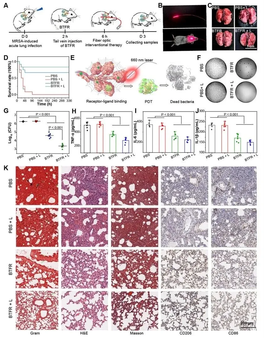 在致死性MRSA肺炎模型中,所有对照组小鼠均在48小时内死亡。相比之下,仅接受BTFR注射(仅捕获,不照射)的小鼠,14天生存率达到66%。而接受完整“BTFR注射+肺部光照”治疗的小鼠,生存率进一步提升至83%,实现了从无人生存到多数存活的根本性逆转。对肺部组织的分析显示,单独光照无杀菌效果。BTFR组通过捕获作用使肺部细菌载量降低约1.65个数量级。而“BTFR+光照”治疗组清菌效果惊人,细菌载量下降2.9个数量级,几乎将肺部细菌彻底扫清。治疗显著降低了肺部灌洗液和血液中关键促炎因子(TNF-α, IL-6, IL-1β)的水平,说明该疗法有效遏制了感染引发的致命“炎症风暴”,减轻了机体自身免疫反应导致的附带损伤。