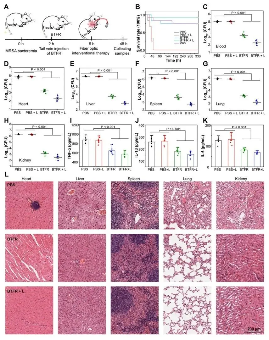 该研究清晰阐明,“肺陷阱”策略治疗败血症的成功依赖于两步协同:首先,BTFR在肺部血管形成“过滤网”,物理拦截并富集循环中的细菌,阻止其向全身器官扩散;随后,通过局部光照激活光动力效应,对已聚集的细菌进行高效清除。所有对照组小鼠在48小时内全部死亡。而仅接受BTFR注射(仅物理捕获)的小鼠,存活率与常用抗生素万古霉素(van)治疗组相当,达到75%。接受完整“BTFR+光照”治疗的小鼠,存活率进一步提升至92%,近乎实现全员存活。感染后48小时检测发现,BTFR治疗使血液、心脏、肝脏、脾脏、肺和肾脏中的细菌负荷均下降超过99.9%。这直接证实“肺陷阱”策略能高效捕获并清除循环于全身的细菌,防止其在各器官定植。治疗显著降低了血液中关键促炎细胞因子(TNF-α, IL-6, IL-1β)的水平,表明该疗法有效遏制了败血症引发的全身过度炎症反应,避免了“细胞因子风暴”对机体的二次打击。
