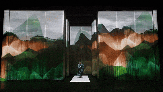 舞台以LED灯管矩阵为核心视觉符号,将长安城抽象为冷峻的科技光网,“荔枝运输”被设计成一场“赛博跑酷”——演员在旋转舞台上攀爬、疾行,配合多媒体投影的路线图与倒计时,仿佛现代打工人与时间赛跑的具象化。