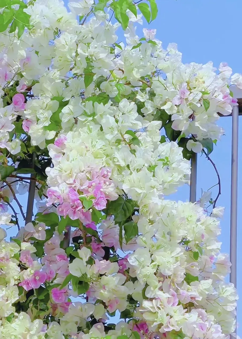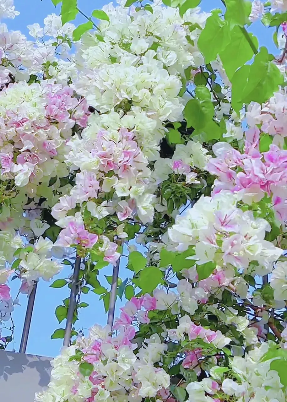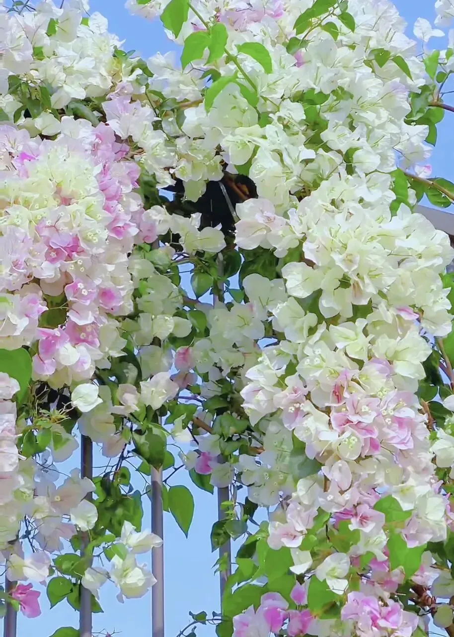 公园西侧的毓秀园则展现了三角梅的精致与繁盛。近万盆三角梅盆景错落排布,有的虬枝苍劲,花朵簇拥其上,如老桩绽放新颜;有的株型小巧,粉白相间的漳红樱簇拥成心形拱门,浪漫又治愈。这里的三角梅更显灵动,或攀附于廊柱,或独立于石径,每一盆都是园艺师精心雕琢的作品,却又不失自然的野趣。漫步园中,既能欣赏到三角梅的形态之美,也能感受到它顽强的生命力——不挑土壤、不畏风雨,向阳而生,岁岁盛放。
