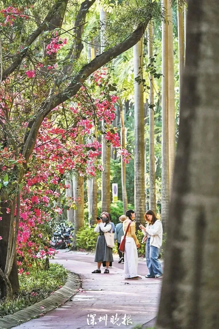另外,近日华侨城香山中街已备好一场以品红为主题的浪漫——路旁三角梅攀援成瀑,把自然馈赠的缤纷尽数泼洒在枝桠间。
