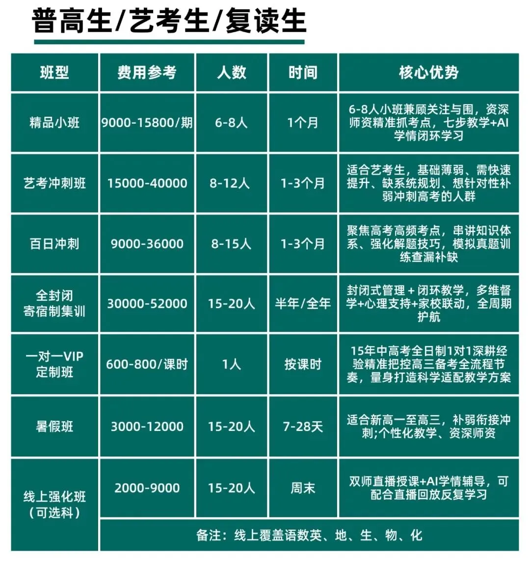 百日集训(8-15人):小班教学,氛围和关注度都能兼顾。适合需要系统复习、专题突破,同时希望保持良好学习氛围的学生。