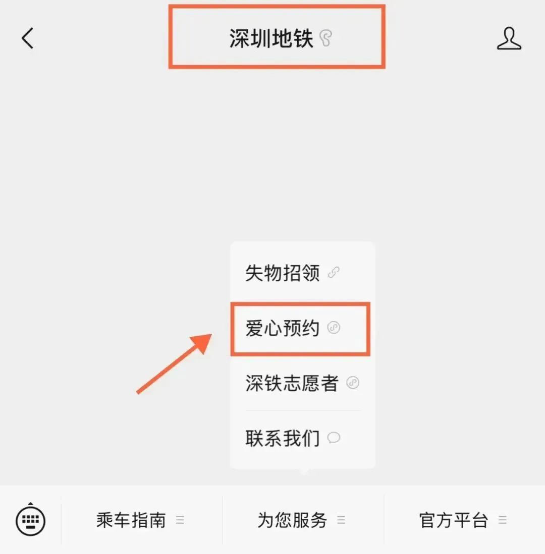 进入“深圳地铁”公众号 → 点击菜单栏【为您服务】→ 选择【爱心预约】