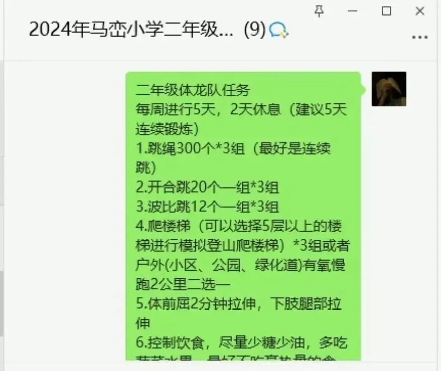 老师为孩子们开具的运动“处方”细致到位。以二年级为例:跳绳300个/组×3组、波比跳12个/组×3组、爬楼梯5层或有氧慢跑2公里,外加体前屈与腿部拉伸;饮食上倡导少糖少油,多摄入粗粮与果蔬。每周运动5天,休息2天。家长们每日在群内分享孩子的运动照片与视频,定期记录体重与身高,让成长有迹可循。