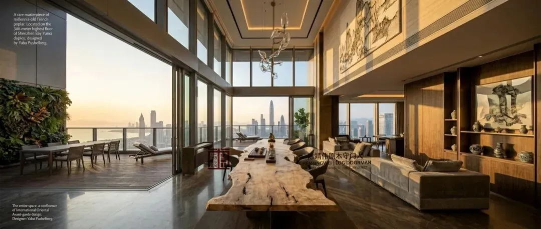 透过巨幕落地玻璃,深圳湾的璀璨与千年白杨的粗粝形成了戏剧性的对比。