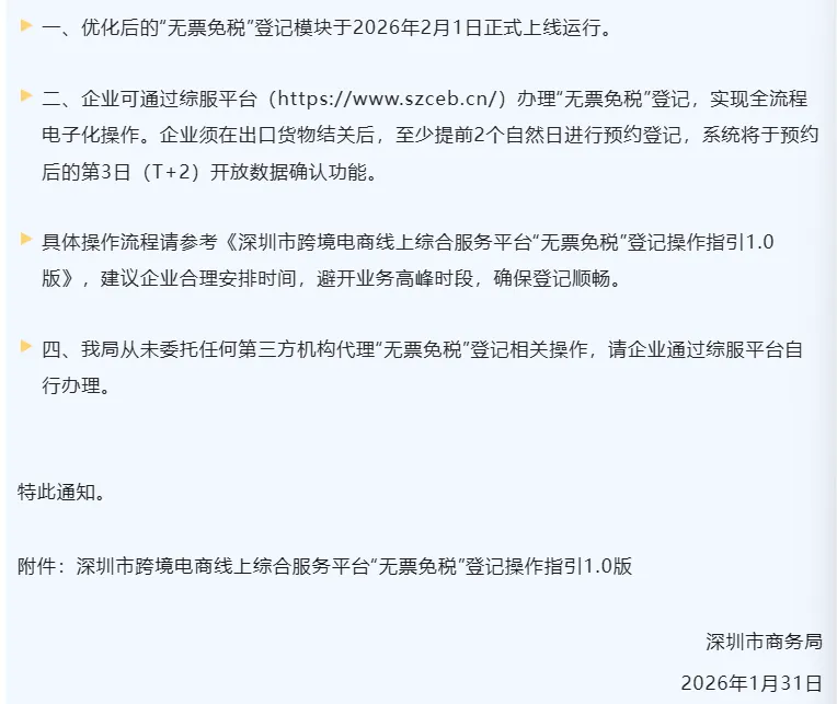 2026年开年,深圳跨境电商圈迎来双重重磅利好!2月1日起,优化升级后的跨境电商“无票免税”登记模块正式上线,同步叠加《跨境电子商务零售出口税收管理办法》全面执行,核心直指“合规省税、简化流程”,彻底破解行业长期困扰的“有货无票”“注册繁琐”“财税模糊”三大痛点,为卖家铺就阳光经营之路。