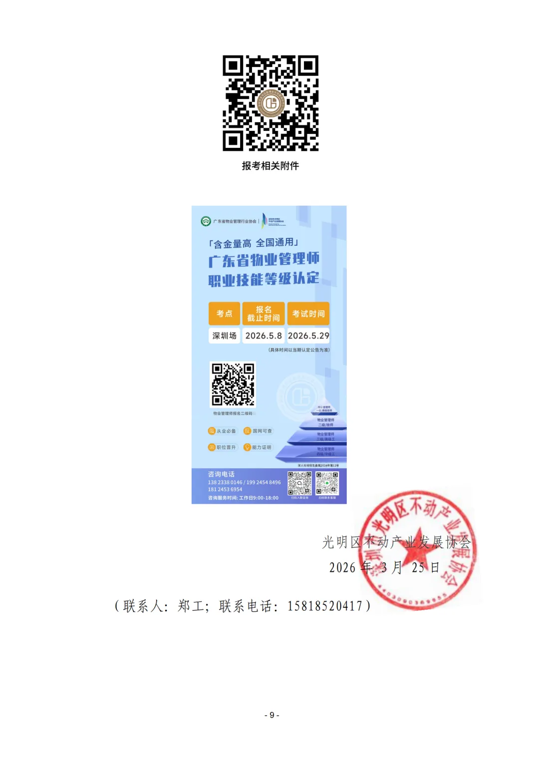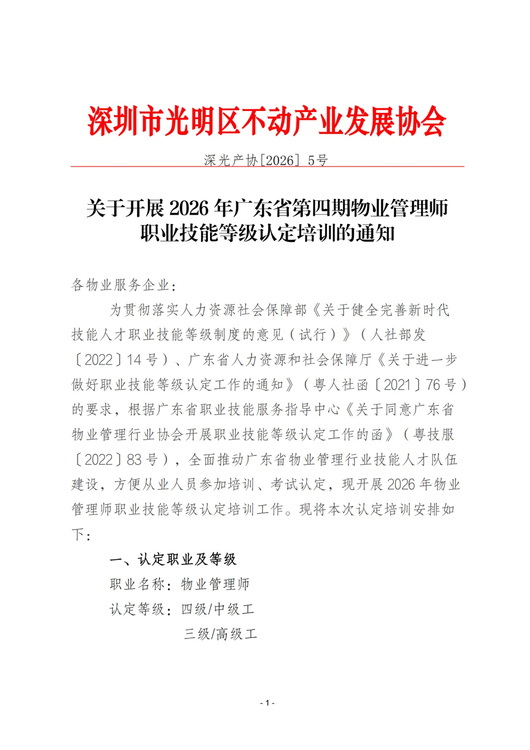 >深圳市光明区不动产业发展协会5号关于开展 2026 年广东省第四期物业管理师职业技能等级认定培训的通知