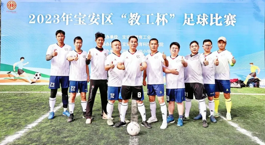 除了陪伴学生晨跑,学校还组建了教工足球队、羽毛球队、跑团等运动队伍,让“组团”形式的运动成为校园常态。这支全区平均年龄最大的教工足球队,曾在宝安区教工杯足球联赛中直面90后、00后对手,队员们即便脚抽筋也咬牙坚持,最终斩获全区第四的成绩,用行动为学生树立了拼搏的榜样。