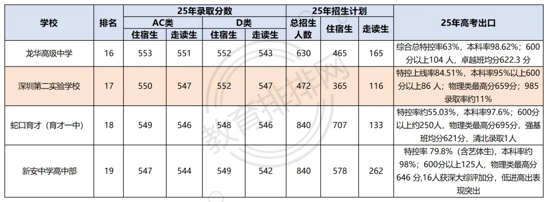 那么如何才能被深二实录取?目前深二实的中考招生,主要分为三大合规路径:全市统一正取、指标生招生、自主招生,不同路径的报考要求、分数门槛各不相同,家长可以根据孩子的成绩和特长,提前做好针对性规划。正常录取即全市统一划线录取,是深圳中考最主流的录取方式,按全市中考成绩排名统一划线,对中考分数要求最高。学校录取排名稳步提升,录取难度中等偏上,中高分考试可以考虑走正取路线。与和同梯队高中相比,深二实的特控率更高,加工能力更强,书院制教学特色鲜明,体育和艺术教育优势突出,且师资力量更雄厚,是中高分考生冲刺优质高中的优选。指标生招生是深圳中考的普惠性政策,50%左右的招生名额直接分配到各初中学校,实行校内排名竞争,而非全市竞争,是很多孩子冲击优质高中的核心机会。25年中考,深二实指标生招生计划为237人,占总招生计划的50%,深户指标生控制线为532分,比正取线低18分;非深户指标生控制线均为552分,比正取低了22分!这就意味着,就算孩子中考分数没达到深二实的正取线,也有机会 “低分被录取”!1、先查孩子初中分到多少深二实的指标生名额: