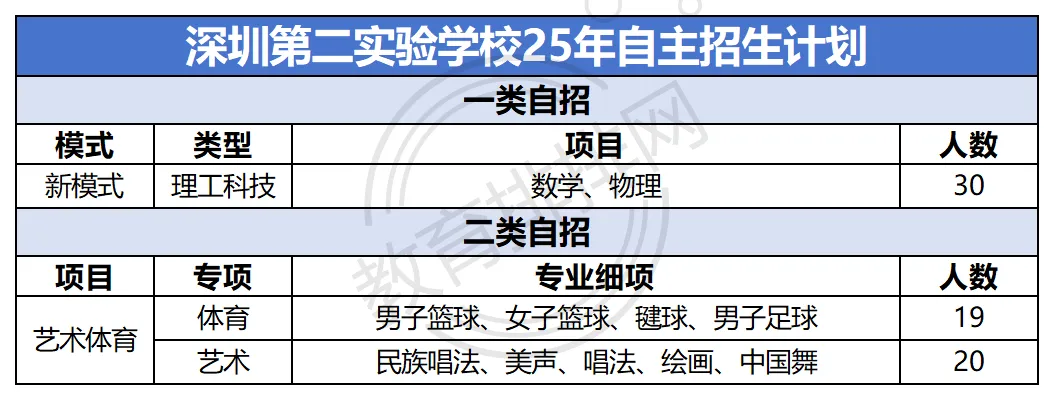 自主招生是深圳中考针对有专项特长的学生,开设的特色录取通道,分为一类学科特长自主招生、二类艺体特长自主招生两大类,自招控制线普遍低于正取线50~100分,且属于提前批,不影响中考正常备考和录取,相当于给孩子多了一次冲刺优质高中的机会。如果说正常录取拼分数,指标招生靠捡漏,那么自主招生就是家长拼认知拼规划的体现。一类自招针对学科特长,25年采用新模式,仅开设理工科技类,共计招生30人,控制线在500分,比正取线低50分。能走这条路的前提是单科特别强,如果你家孩子总分走正取和指标有难度,但是单科特别强,这就是一条要重点关注的路径。二类自招针对艺体特长,艺术、体育、音乐都有招生,共计招生38人,孩子有相关特长的家庭可以重点关注,艺术类控制线在438分,体育类控制线在411分, 正取线低了112-139分!如果你家孩子有学科或艺体方面的特长,自招就是孩子低分进是深二实的最大机会,想进一步了解深二实自招计划可点击链接查看👉:深二实自主招生计划查询不过要提醒家长,学科类自招基本不影响文化课学习,家庭负担也小;但艺体类需要长期训练、投入时间和精力,是否选择,一定要结合孩子的成绩、兴趣和未来高考方向综合考虑。