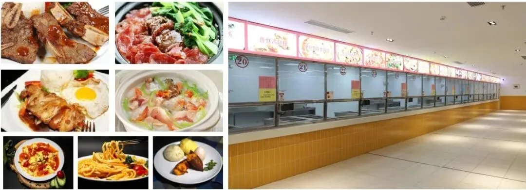 食堂:校内有2个大型食堂,可容纳2000 余人同时就餐。菜式涵盖粤、川、湘、北方及清真等菜系,另有小吃、水果、甜品等。食材安全卫生,日均消费30-40元,支持校园卡刷卡及线上充值查询。