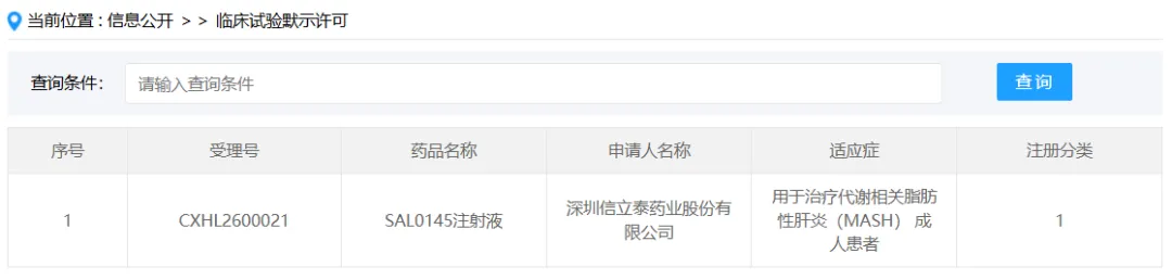 近日,深圳信立泰药业股份有限公司收到国家药品监督管理局核准签发的《临床试验批准通知书》,同意公司自主研发的创新药物SAL0145注射液开展代谢功能障碍相关脂肪性肝炎(MASH)的临床试验。