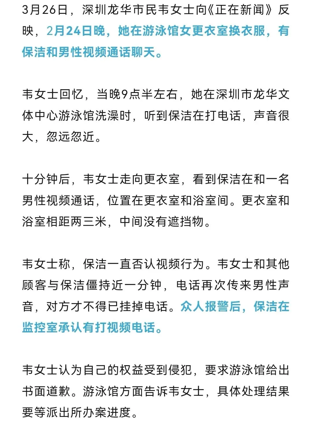 深圳一保洁在女更衣室与男性视频聊天,游泳馆回应:已开除