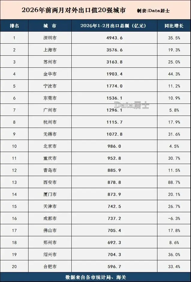 西安市的出口值在上年同期还不到500亿而还未能跻身20强,2026年前两月暴涨后规模达到近900亿而直接跃居至第13位,要比厦门、天津、佛山等沿海老牌出口强市都要高了。