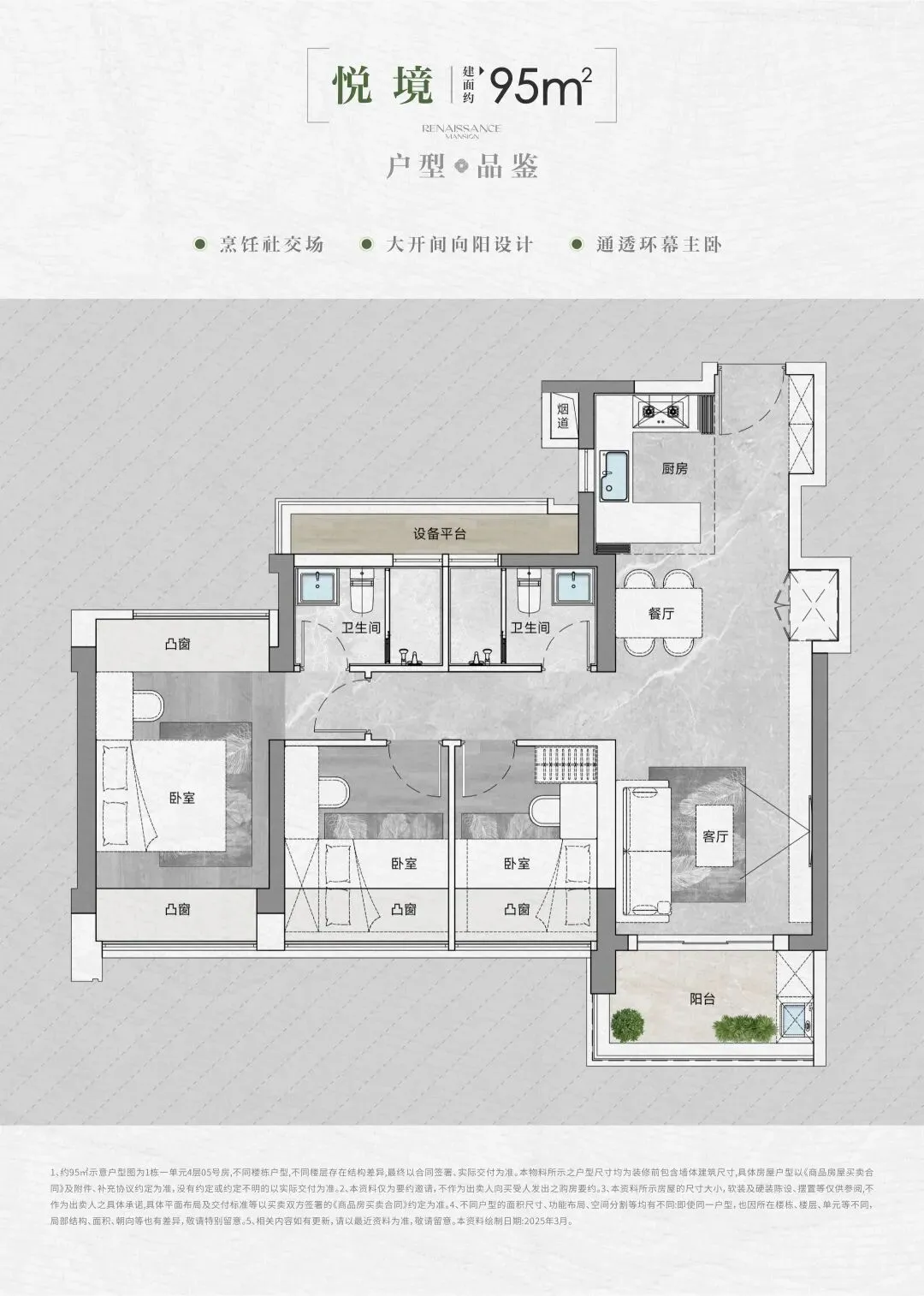 🖼空间美学 | 新规下的迭新演绎:以高使用率、精细化场景、可进化空间,精致演绎新规下的栖心奢宅,将空间让渡给生活,不设边界重构亲密家庭社交场域,引领悦已栖心的生活美学。 面积与户型:推售房源涵盖建面约90-95-105-143㎡的3-4房,共298套可售房源。其中,95/105㎡三房户型以朝东为主;90㎡三房户型朝西;143㎡四房大户型东南朝向。
