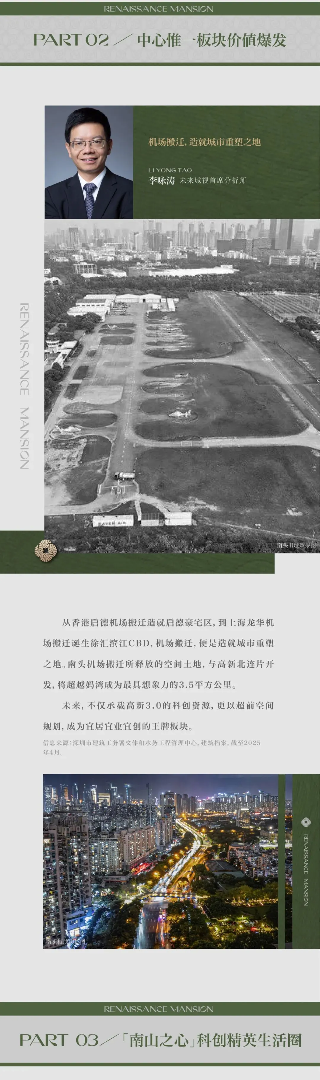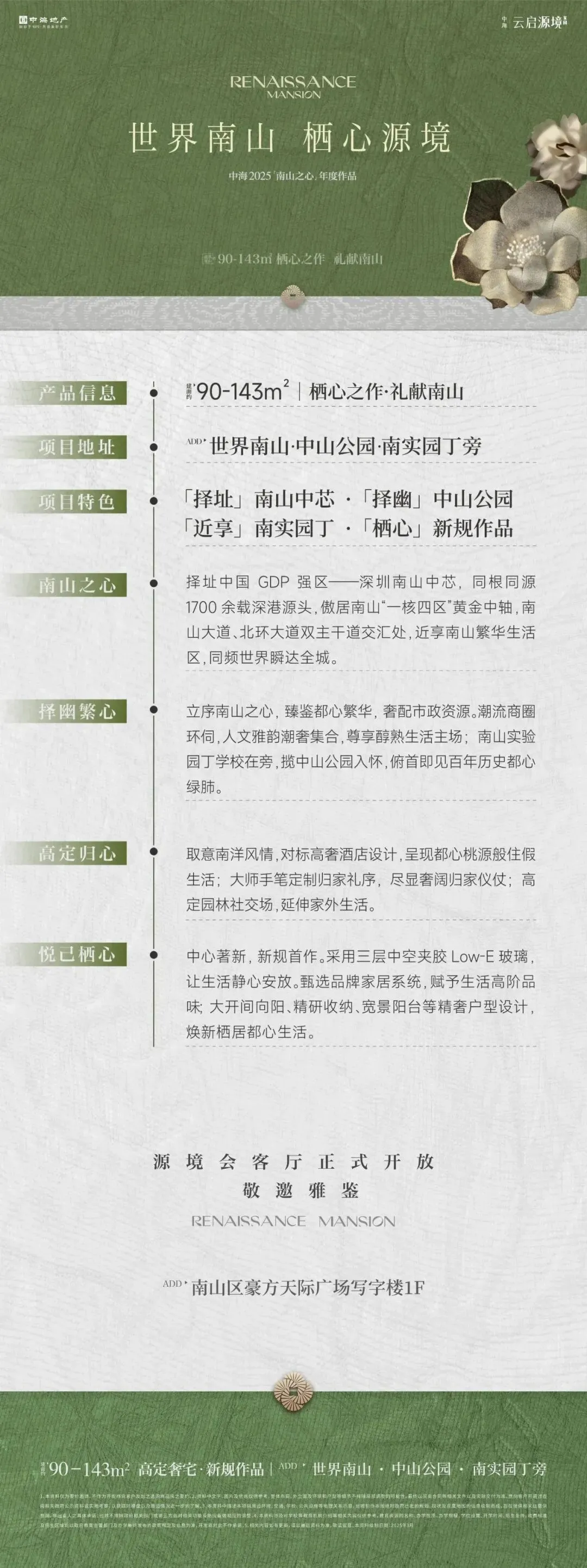 🌳中央公园住区——择幽而栖:项目位于都心静谧的中央公园住区,近邻百年中山公园,拥览约 49 万㎡城央绿肺,占据稀缺的自然资源与景观盛境。(数据来源:孙中山故居纪念馆官网)📒人文菁英高地——优教同源:项目旁即为南实园丁学校,同源南山实验集团优教资源。片区内坐落南实麒麟、深圳艺术学校等优质学校,优教氛围浓厚。🛍漫享精奢烟火——繁华奢境:项目所在南山中芯醇熟生活圈,奢配市政资源,潮流商圈环同,可达前海山姆旗舰店、壹方城、万象前海、壹方汇等购物中心。PART 03 【高定归心】