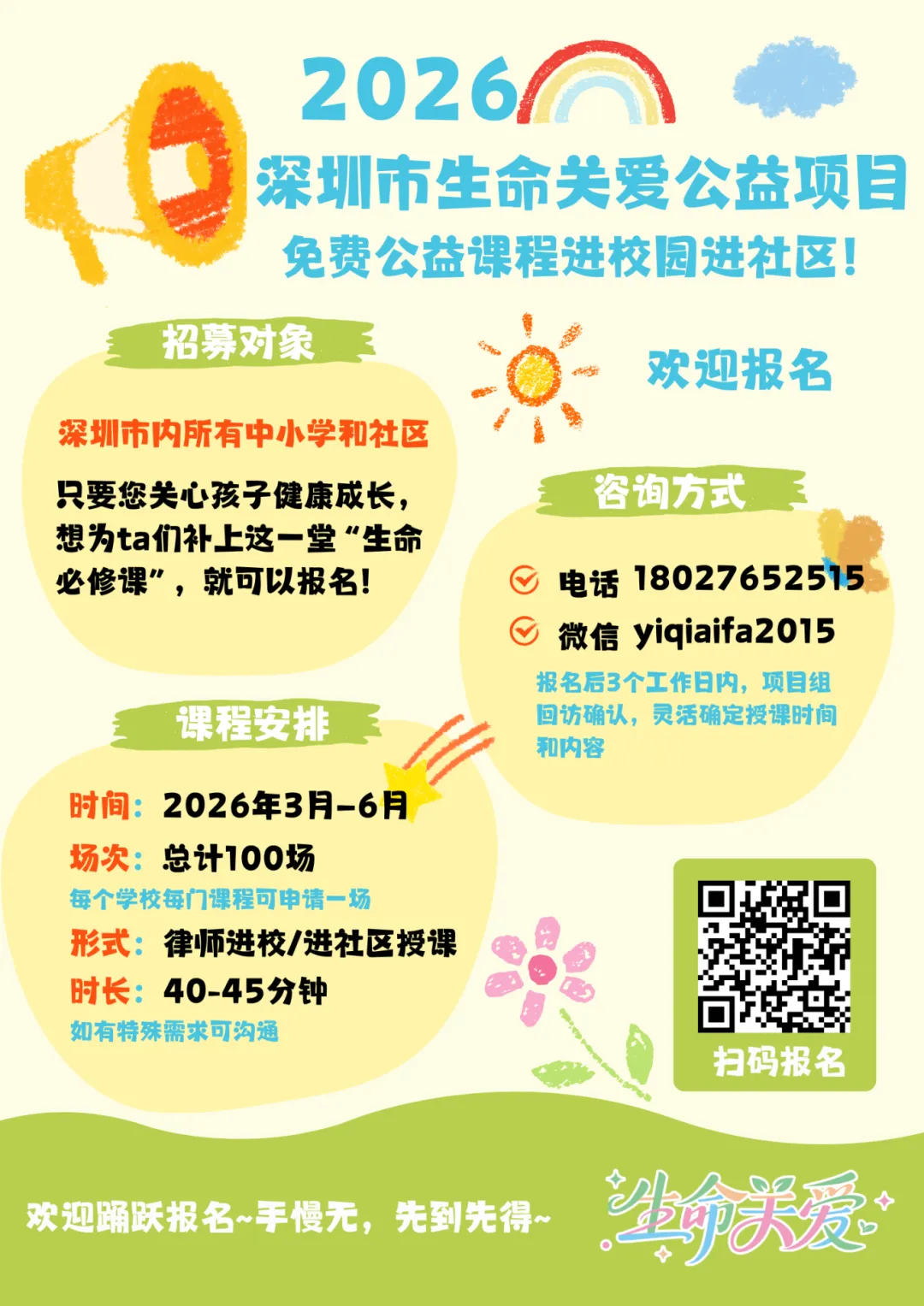 活动简介:围绕未成年人保护法+防欺凌+防性侵三大核心主题,100场免费普法课程开始招募啦!资深律师讲师团送教进校园、进社区,给成长满满的安全感,用法律守护童年,用行动传递温暖。