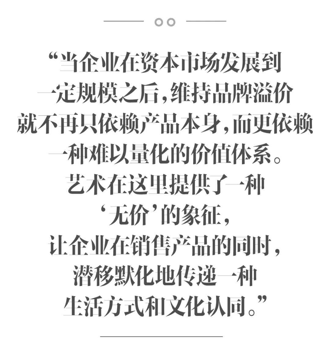 企业为何愿意投入如此重资产的文化项目?肖朗解释道:“当企业在资本市场发展到一定规模之后,维持品牌溢价就不再只依赖产品本身,而更依赖一种难以量化的价值体系。艺术在这里提供了一种‘无价’的象征,让企业在销售产品的同时,潜移默化地传递一种生活方式和文化认同。更进一步,这种投入还承担了某种‘文化洗白’(artwashing)的功能,即缓解公众对企业商业行为的道德焦虑。”