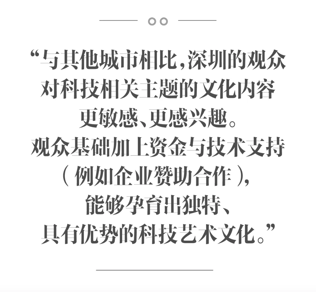 其次,深圳长期被视为“文化荒漠”,但正因为缺乏历史包袱,这座城市也拥有重新定义自身文化角色的空间。作为科技之都,它天然具备孕育特色科技艺术文化的土壤。虎头进一步指出:“与其他城市相比,深圳的观众对科技相关主题的文化内容更敏感、更感兴趣。观众基础加上资金与技术支持(例如企业赞助合作),能够孕育出独特、具有优势的科技艺术文化。”换言之,深圳不仅能提供观众,更能提供实验与创新的生态环境,使科技与艺术结合产生新的文化样态。