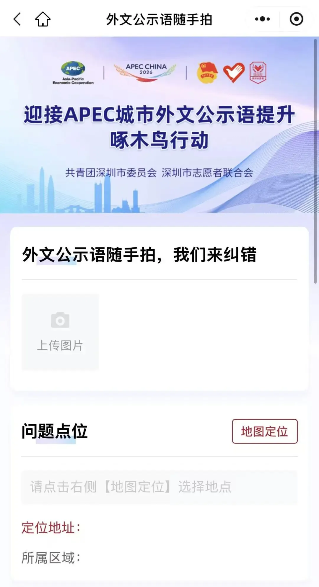 譬如,针对外文公示语有不准确的情况,深圳团市委、市志愿者联合会发起城市外文公示语提升“啄木鸟行动”,邀请每一位市民走上街头,用手机拍下那些不清晰、不准确的公示语,并在“志愿深圳”小程序的外文公示语问题反馈专区,一键上传“Bug”。