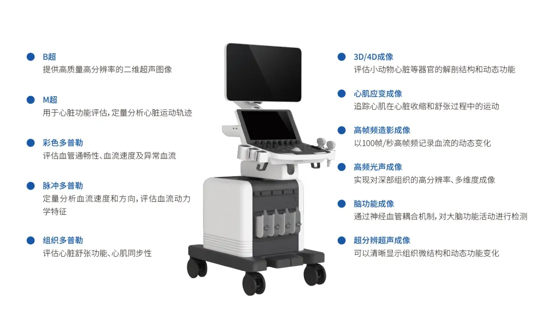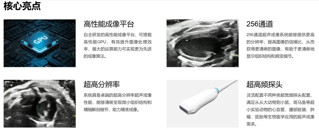 1.高分辨率成像:50μm超高分辨率突破声学衍射极限,让胚胎心脏瓣膜开合、肿瘤微血管新生等微观事件实现清晰观测;