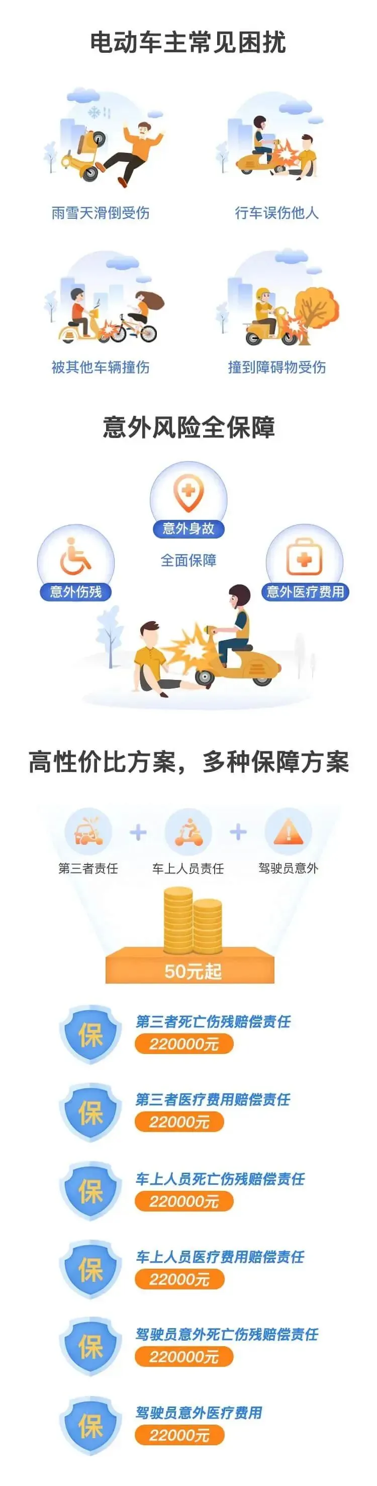 冬天路面结冰湿滑,如果骑电动车上班途中避让行人或者车辆,不小心摔倒骨折了,或者出现其他意外事故,那么因意外产生的医疗费用,这款保险可以保障。