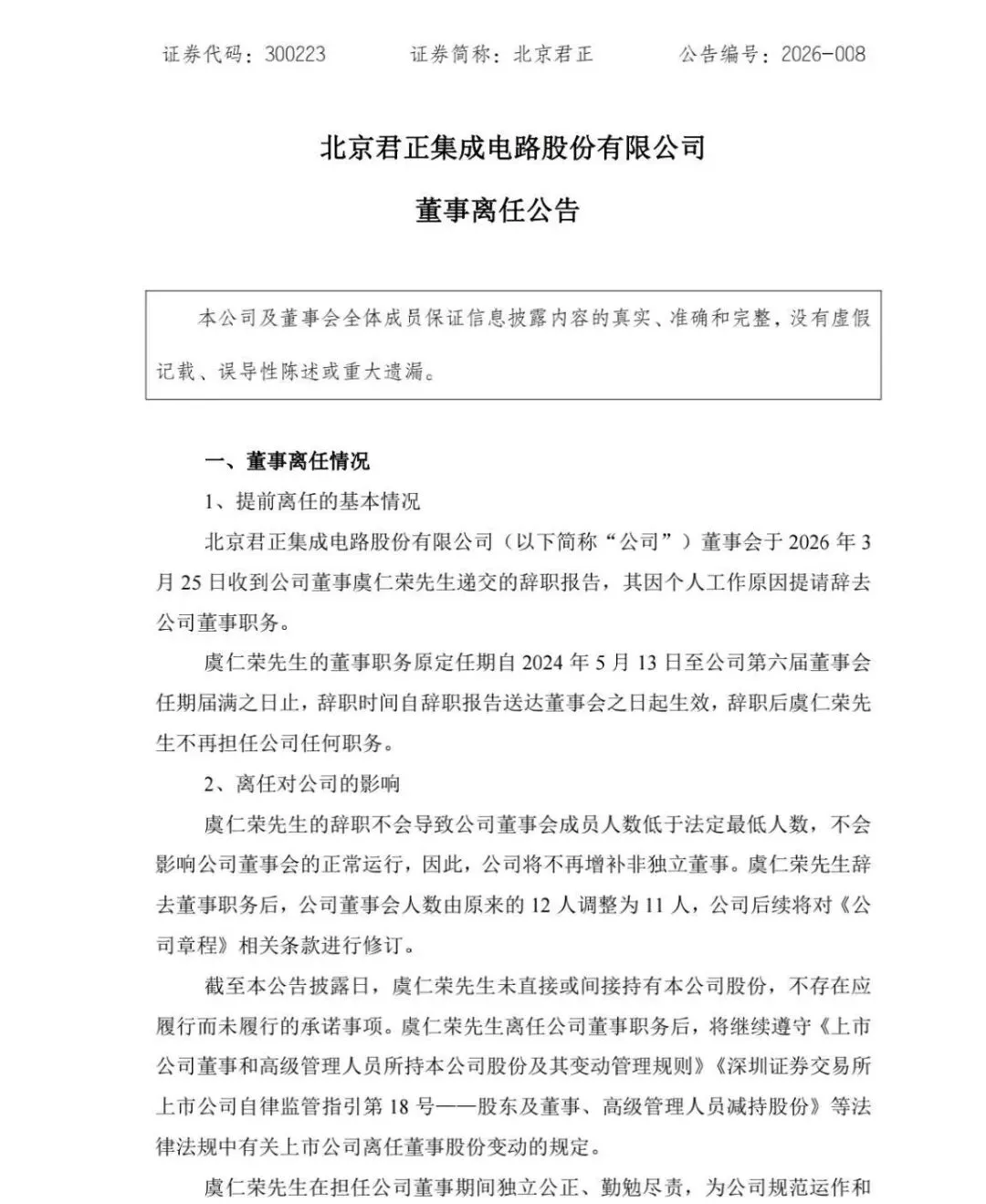 北京君正表示,虞仁荣先生在担任公司董事期间独立公正、勤勉尽责,为公司规范运作和健康发展发挥了积极作用。在此,公司对虞仁荣先生在任职期间为公司发展所做出的贡献表示衷心的感谢。