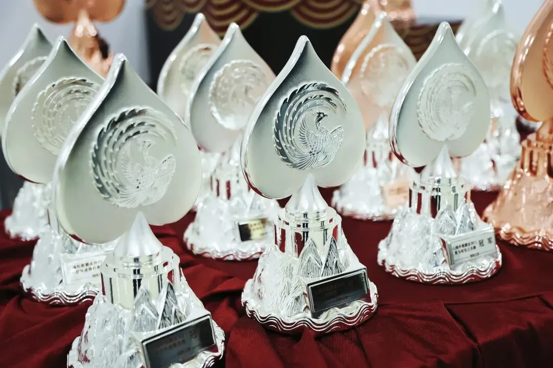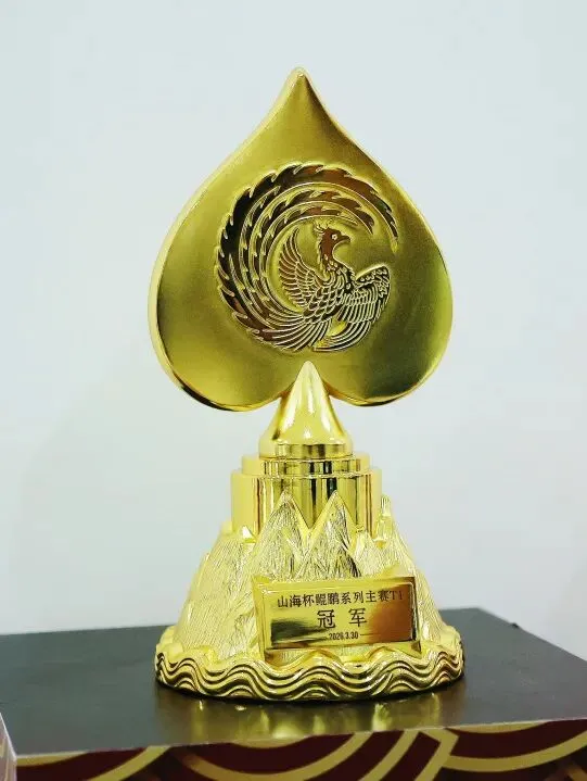 山海杯鲲鹏系列赛的冠军奖杯,以黑桃形轮廓为核心造型,顶端錾刻着振翅欲飞的凤凰图腾,羽翼卷草纹细腻流转,仿佛裹挟着山海间的磅礴灵气。金色的冠军杯如旭日熔金,铜色奖杯似晚霞凝焰,银色奖杯像霜华淬炼,每一道棱线、每一处铭文都在诉说着扑克竞技的荣耀与热血,它们静置于酒红绒布之上,既像蛰伏的神兽等待新王加冕,又似无声的号角,召唤着选手们向巅峰发起冲刺。