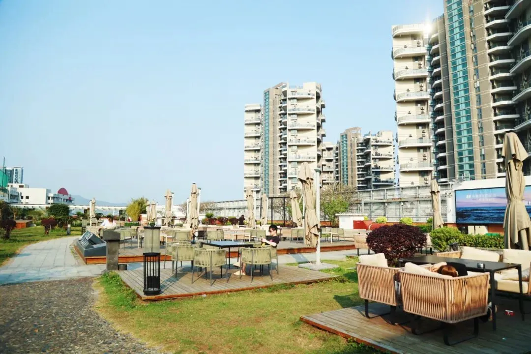 露台则是一方融合“城市露营”美学的松弛天地。木质地板上,藤编座椅与原木小桌错落有致,浅色遮阳伞为休憩者撑开一片荫凉。