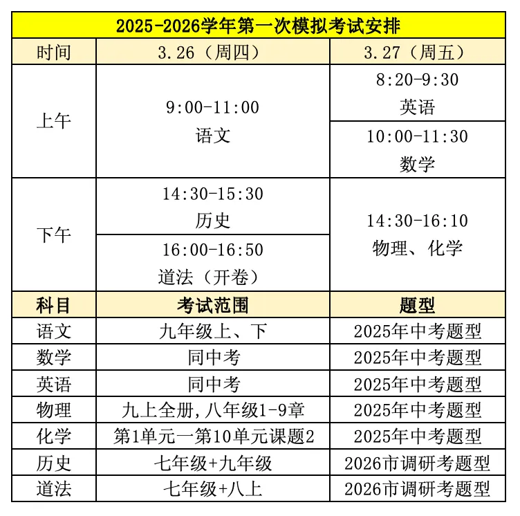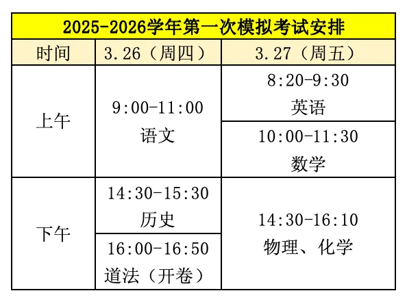 深中体系第一次模拟考试安排在3月26日-3月27日(也有家长反馈考试时间为4月2日,具体以学校通知为准),考试时间及范围参考如下: