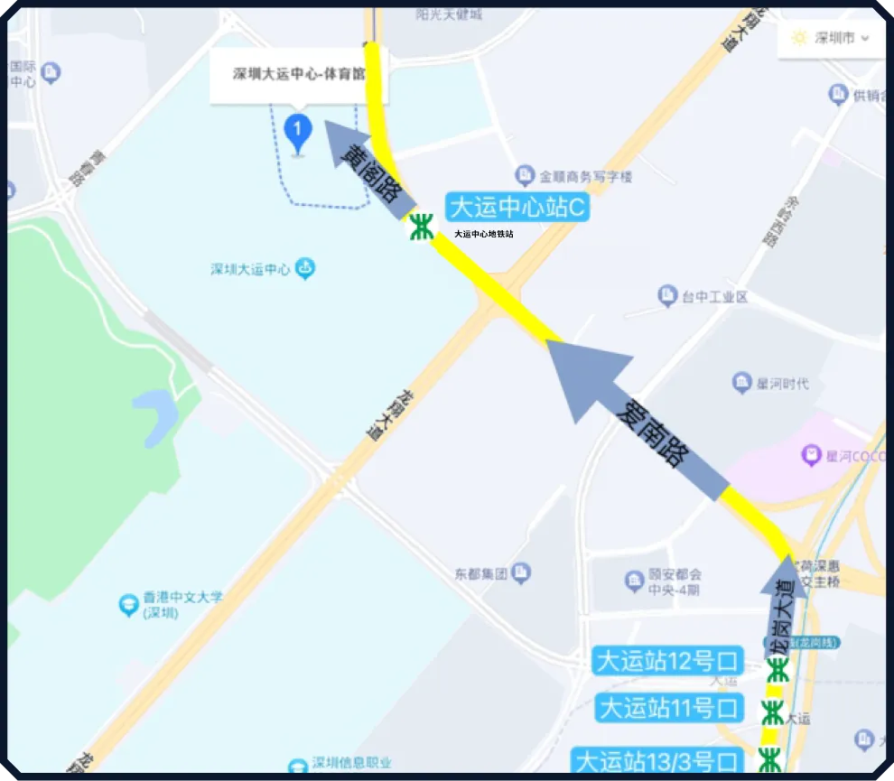 ②乘坐深圳地铁3号线及14号线至大运站3/11/12/13号出口