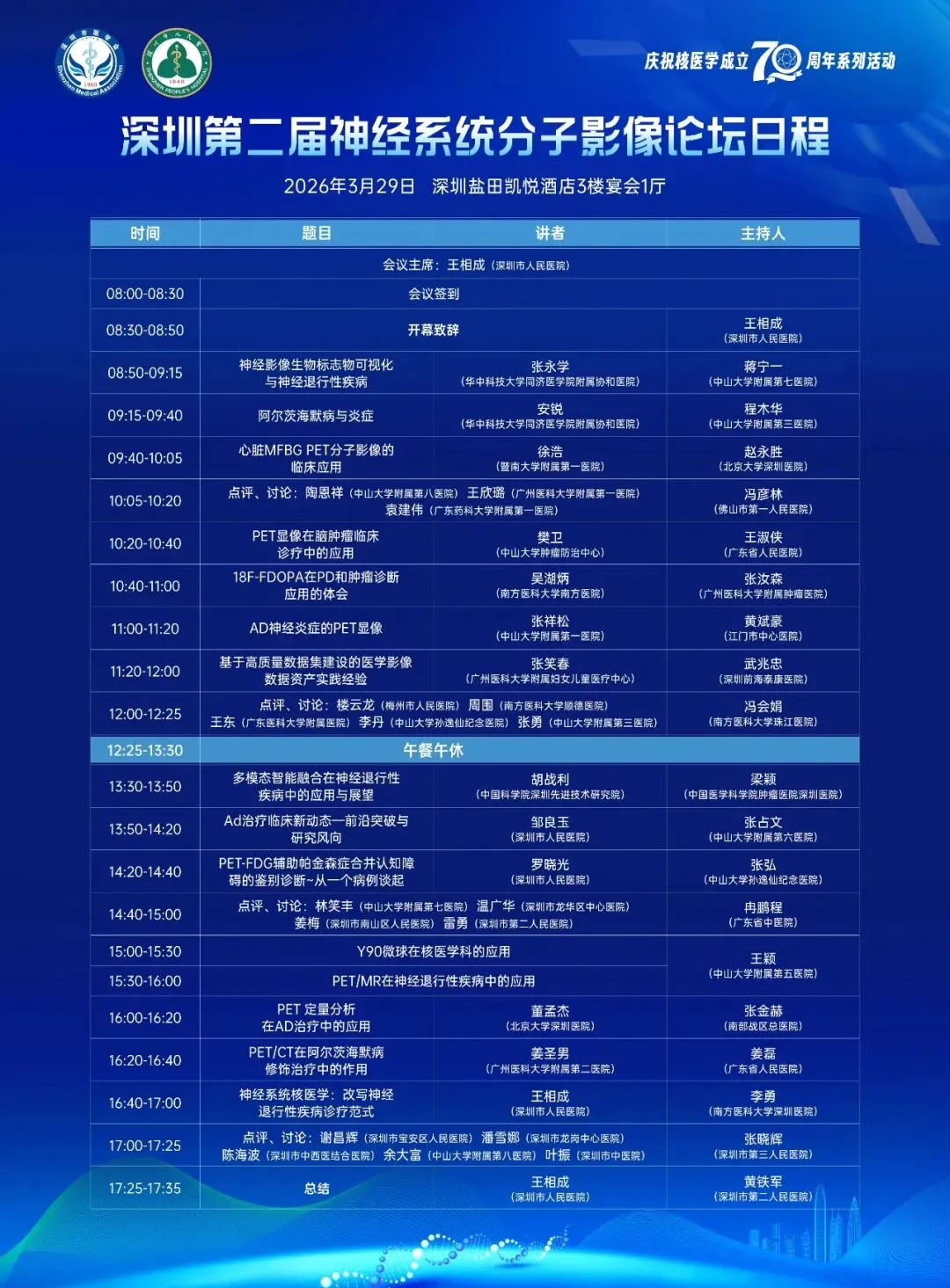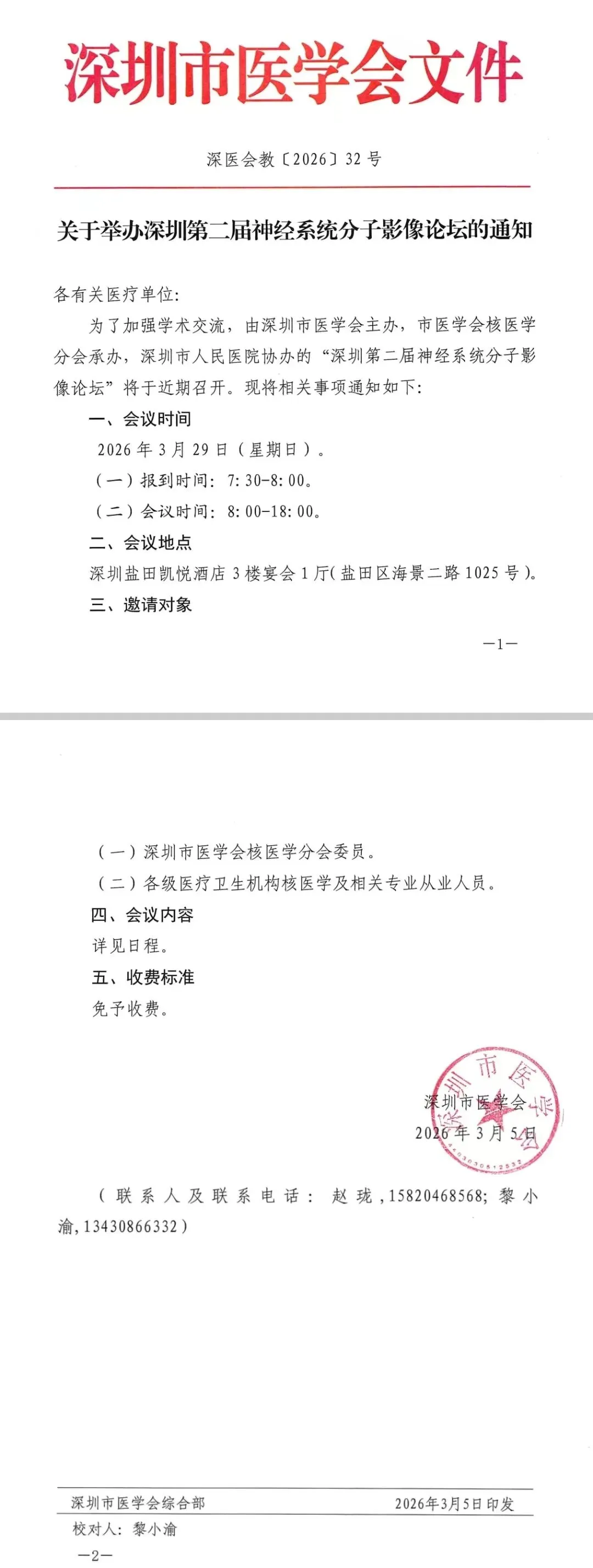 为了加强学术交流,由深圳市医学会主办,深圳市医学会核医学分会承办,深圳市人民医院协办的“深圳第二届神经系统分子影像论坛”将于2026年3月29日在深圳召开。