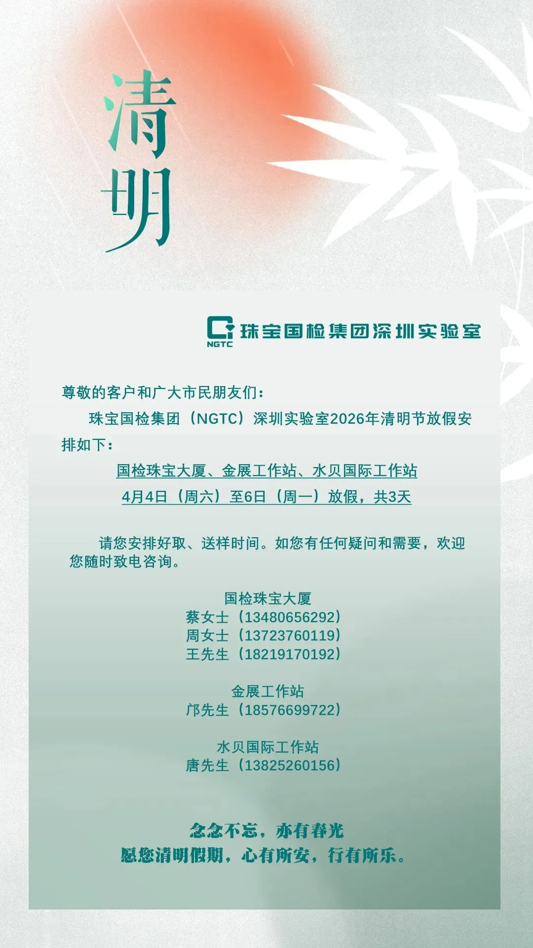 【重要通知】珠宝国检集团深圳实验室2026年清明节放假通知