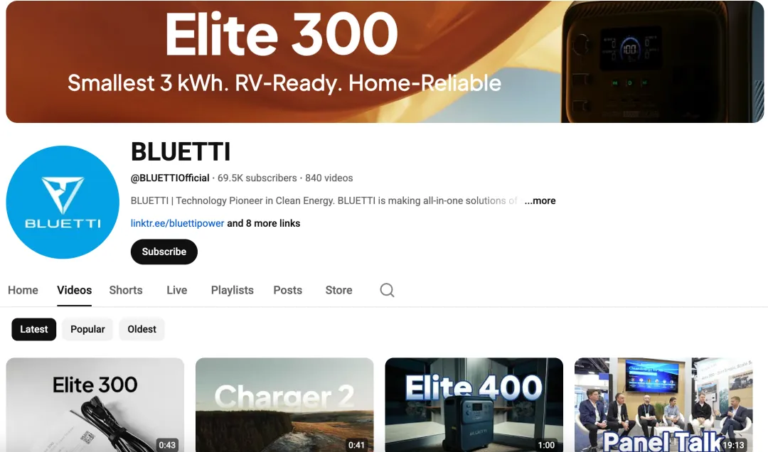 TikTok之外,BLUETTI在YouTube、Facebook同样建立了内容阵地,培养品牌忠诚度。内容以深度测评、产品教程、用户故事为主,与TikTok的轻量短视频形成互补。