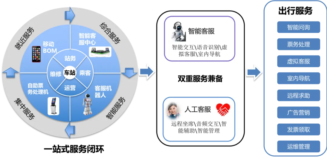 首次提出并落地一体化智慧客服体系,实现提供“智能自助一体化”、“服务对象全场景化”,旨在提供全流程的地铁服务一体化解决方案。一体化综合服务:智能客服中心
