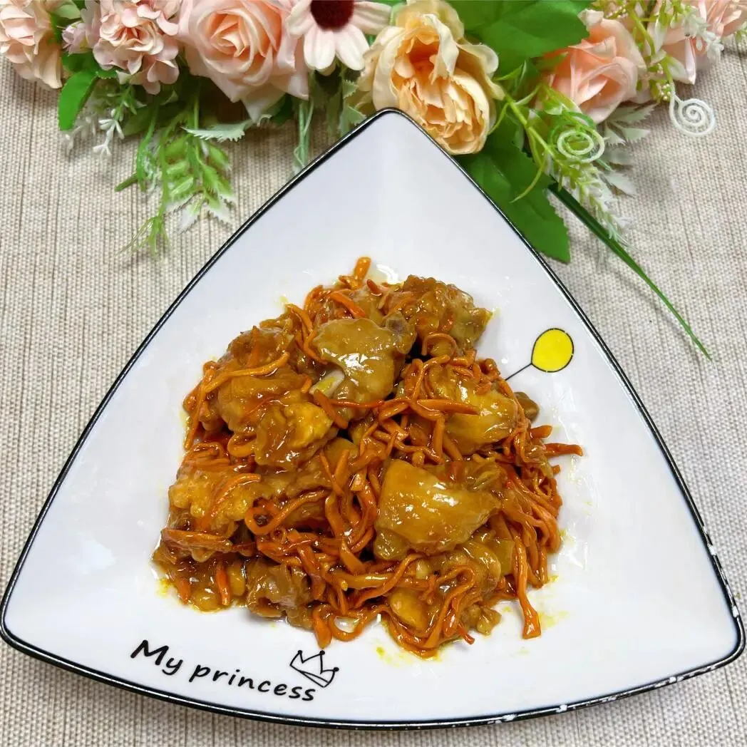 虫草花蒸鸡块、口蘑炒牛肉、清炒上海青、青橄榄石斛骨头汤、香米饭