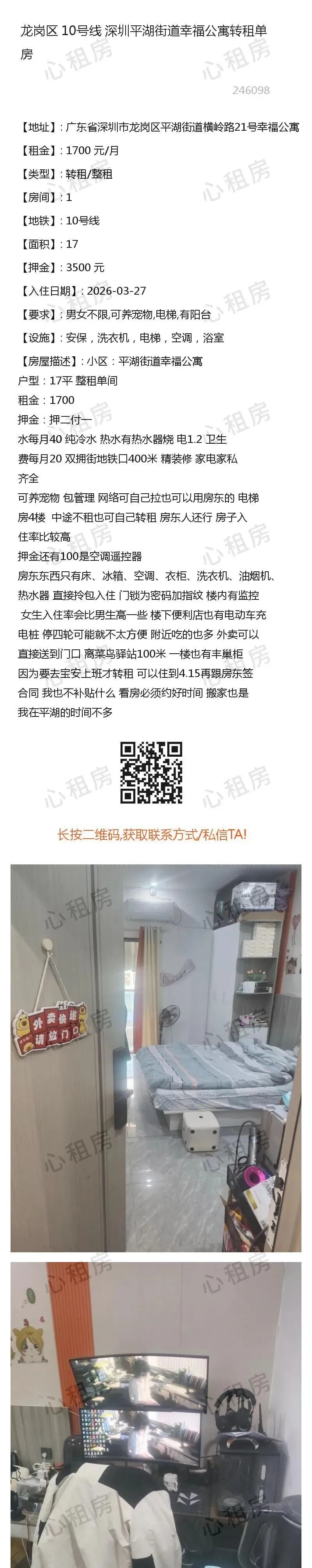 深圳租房>>龙岗区10号线深圳平湖街道幸福公寓转租单房1700元/月
