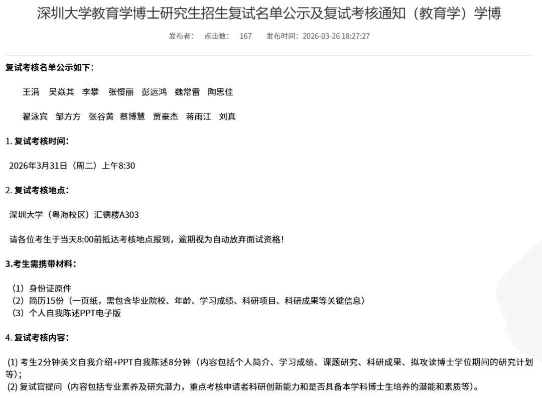 深圳大学2026年教育学博士招生复试名单公示及复试考核通知
