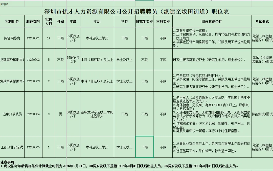 深圳市优才人力资源有限公司公开招聘聘员(派遣至坂田街道)的公告我司拟于近期面向社会公开招聘聘员25名,派遣至坂田街道办事处工作。现公告如下: (五)十八周岁以上,具备拟任岗位所要求的准入条件和其他资格条件,年龄时间计算截至2026年3月31日。 (一)尚未解除党纪、政纪(行政)处分或正在接受纪律审查的,以及涉嫌违法犯罪正在接受司法审查尚未作出结论的; (二)曾因犯罪受过刑事处罚、被开除中国共产党党籍、被开除公职、被依法列为失信联合惩戒对象的; (三)被辞退未满五年的原机关事业单位工作人员(含公务员、职员、编外人员); (四)参加机关事业单位招聘被认定有考试作弊行为在限制报考期限内的; (五)现役军人,未完成教学大纲规定学习内容的结业生、肄业生; (七)法律、法规规定不得聘用为机关事业单位工作人员的其他情形。 1.报名方式:现场报名,报考者须本人到场,不可委托他人代报名,每名考生限报1个岗位。 现场报名地址:深圳市龙岗区龙城街道丰隆深港科技园5栋A座13楼。 2.报名时间:2026年4月1日至2026年4月3日(工作日)9:30-11:30,14:30-17:30。 (1)《深圳市龙岗区公开招聘聘员报名表》(附件2,报名表张贴近期1寸或2寸免冠彩照1张,承诺人处手写签名); (3)毕业证书及学位证书原件、复印件,教育部学历证书电子注册备案表、中国高等教育学位在线验证报告(登录“学信网”验证;毕业证书、学位证必须在报名时已持有),留学归国人员需提供教育部留学服务中心出具的《国外学历学位认证书》; (4)无犯罪记录证明(原件,由户籍所在地派出所或公安分局开具),如报名时无法提供可后补; (7)报考职位要求的其他材料(如退伍军人证、党员证明材料等)。 4.报考人员请认真对照自身条件自行判断与招聘岗位要求是否相符,规范提供相关材料。个人材料提供不齐全或条件与招聘岗位要求不符,后续资格审查或招聘不通过,后果由考生本人承担。 5.报考人员所留的联系电话、QQ、微信、电子邮箱、通讯地址必须真实准确,确保能够及时联系本人。因提供错误联系信息或未保持通讯畅通导致无法及时联系的,由报考人员本人承担后果。除无犯罪记录证明可后补,其他材料必须齐全,否则不予报名。 6.报名期间同时进行资格初审,为保证现场报名工作顺利进行,报考人员需于报名当天刷本人身份证取号签到,未在规定报名时间(9:30-11:30,14:30-17:30)内取号的不再接收报名材料。证件材料不全且不能在报名期间的当天18:30前补全的或与报考资格条件不符的,初审不通过。建议所有报考人员尽早到达现场取号,预留足够时间进行报名。初审通过的考生方可参加后续考试流程。 报名咨询电话:0755-89450163(工作日9:00-12:00,14:00-18:00)。 党政事务辅助岗、综合网格岗、工矿企业安全员由笔试和面试组成。经资格初审,招聘岗位符合条件的报考人数未超过拟招聘人数5倍(含5倍),则采取直接面试的方式进行,无需进行笔试。招聘岗位报名人数超过5倍的,需先进行笔试,成绩合格线为60分。对笔试合格的考生,按照笔试成绩分数高低排序,根据拟招聘人数的5倍,确定入围面试人选,若笔试合格人数少于拟招聘的5倍,则所有笔试合格的考生均列为入围面试人选。 应急分队队员由体能测试和面试组成。体能测试项目成绩合格线为60分,体能测试项目为3000米长跑、俯卧撑、引体向上、仰卧起坐。因岗位特殊性,报考人员均需参与体能测试,对体能测试合格的考生,按照体能测试成绩分数高低排序,根据拟招聘人数的5倍确定入围面试人选;若体能测试合格人数少于或等于拟招聘人数的5倍,则所有体能测试合格的考生均列为入围面试人选。 进入面试的考生,由用工单位进行资格复审,资格复审不合格取消面试资格,并按分数高低进行递补。资格复审合格进入面试及后续程序。 党政事务辅助岗、综合网格岗、工矿企业安全员面试成绩合格线为60分。对面试合格的考生,依总成绩(按笔试占40%、面试占60%合成考试总成绩)分数高低排序,按照拟招聘岗位人数1:1比例确定体检人选。总成绩相同的,面试成绩高的确定为体检人选;笔试、面试成绩均相同的,按面试主评委给分高低确定体检人选。 应急分队队员面试成绩合格线为60分,对面试合格的考生,依总成绩(按体能测试占60%、面试占40%合成考试总成绩)分数高低排序,按照拟招聘岗位人数1:1比例确定体检人选。总成绩相同的,体能测试成绩高的确定为体检人选;体能测试、面试成绩均相同的,按面试主评委给分高低确定体检人选。 同类型岗位可设置岗位备选人才库,准入条件应为总成绩合格,且岗位排名前50%(综合网格岗、工矿企业安全员、应急分队队员等岗位为80%)的未聘人员;自发布公告之日起一年内,如同岗位出现空缺,可在备选人才库中依次递补。 总成绩及体检人员名单将于考试结束后,在龙岗政府在线(http://www.lg.gov.cn)、深圳市优才人力资源有限公司网站(http://www.szychr.cn)公布。 由深圳市优才人力资源有限公司统一组织到指定的医院进行,体检费用由考生自理。体检合格者,纳入拟聘用人员予以公示。体检不合格者,不纳入拟聘用人员,所空出的名额按考试成绩排名先后依次审核递补。 对体检合格的拟聘用人员,在龙岗政府在线(http://www.lg.gov.cn)、深圳市优才人力资源有限公司网站(http://www.szychr.cn)公示3个工作日。 公示结束无异议并报区人力资源部门
