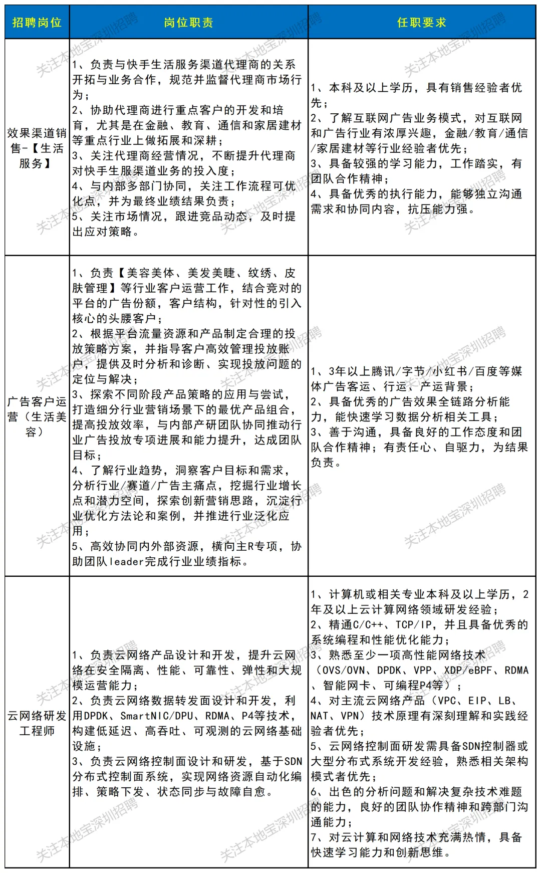 ⭐推荐服务:点击下方卡片,关注【本地宝深圳招聘】公众号,回复【快手】,即可获快手招聘官网入口,查看最新岗位,还可以获取快手校园招聘公告+岗位+投递入口