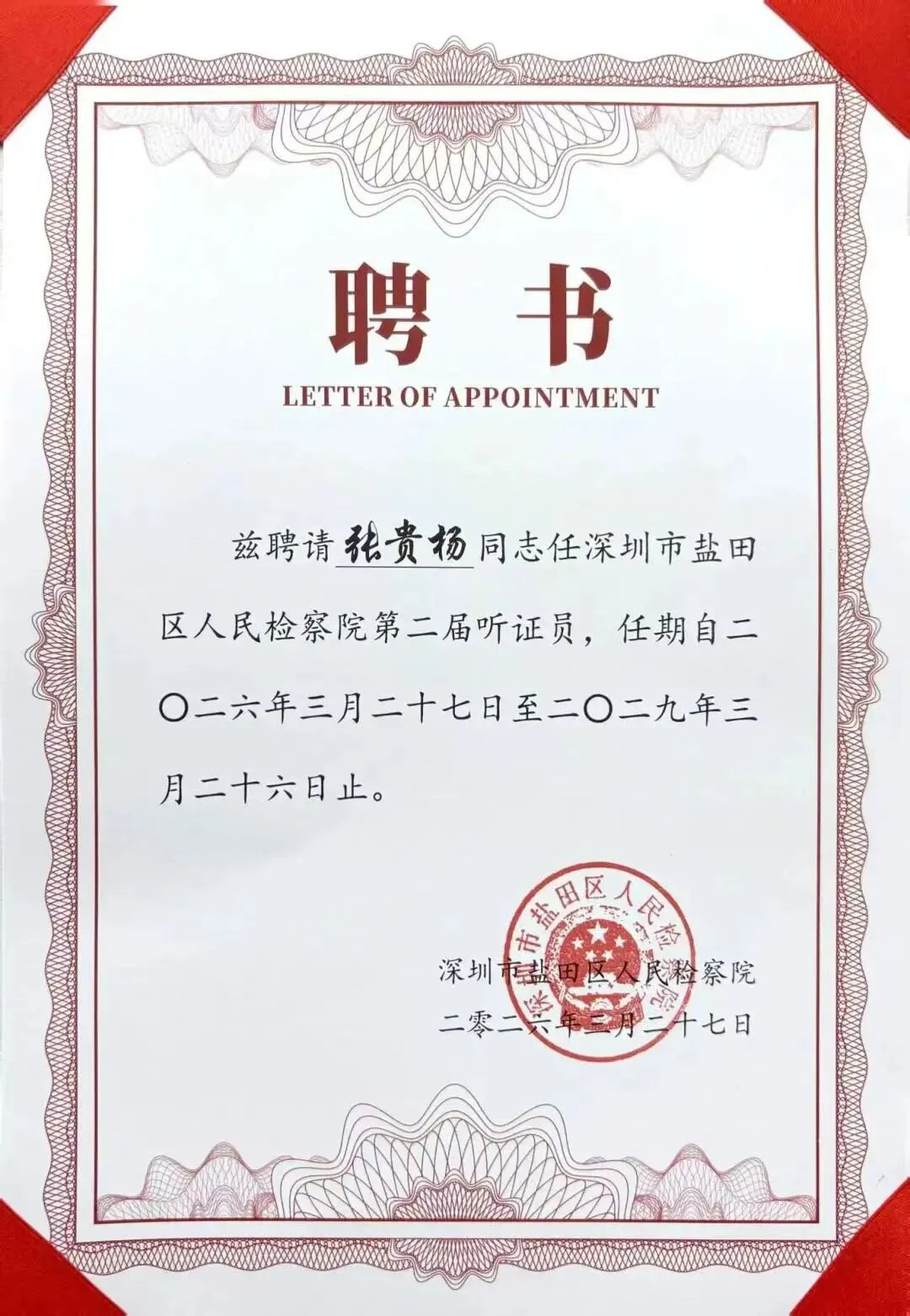 【热烈祝贺】深圳市江西万年商会理事张贵杨律师获聘深圳市盐田区人民检察院第二届听证员