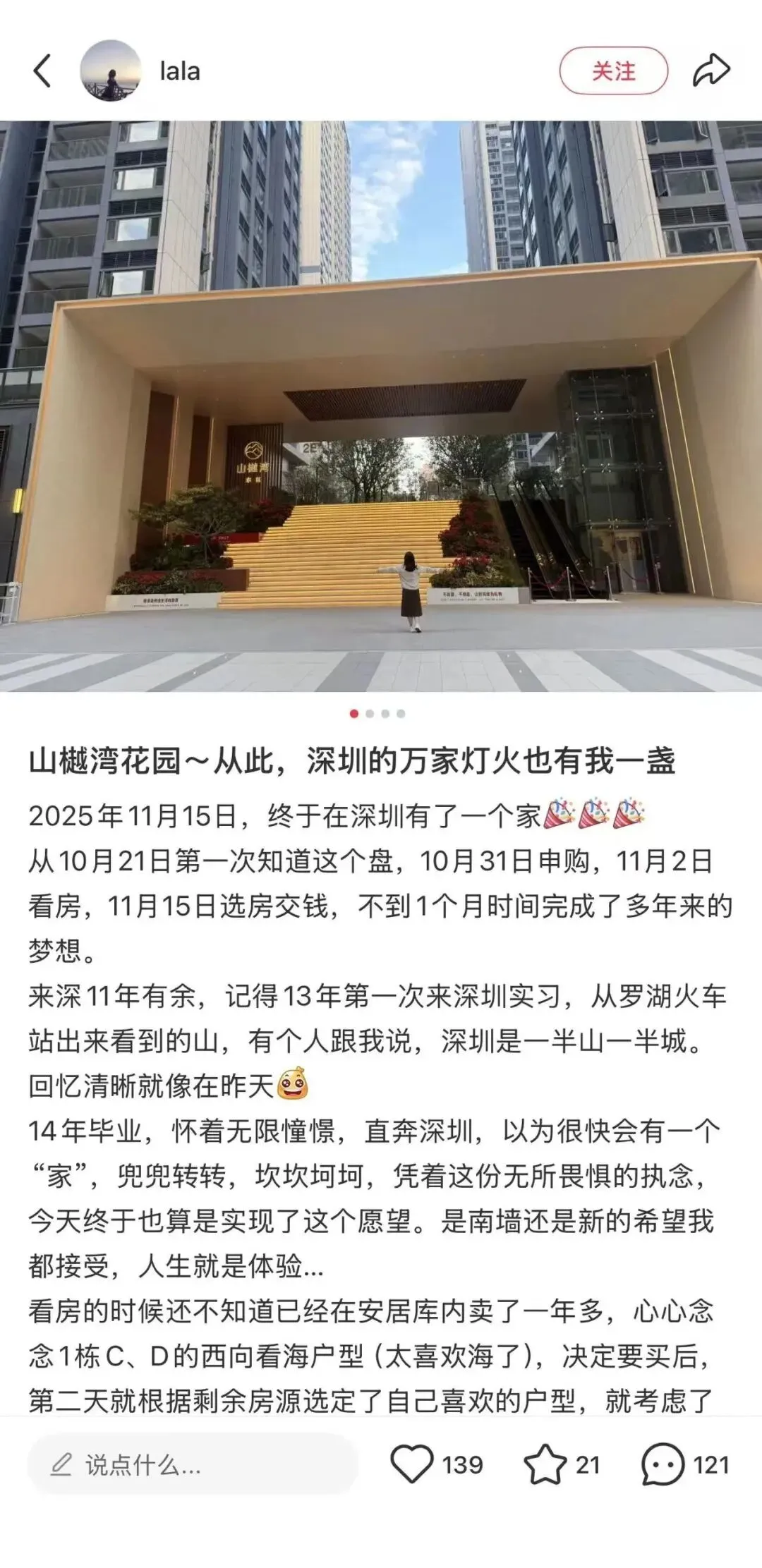 在小红书上,我们看到了很多山樾湾的业主在分享自己的心得:11年的深漂,用了不到1个月实现在深圳安家圆梦,尤其是那句“从此,深圳的万家灯火也有我一盏”,是多少新深圳人说不出的内心自豪。