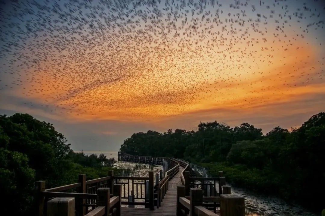 黄昏时福田红树林生态公园天空中飞翔的候鸟