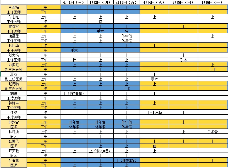 深圳市妇幼生殖中心(4月1日—4月6日)医生排班表