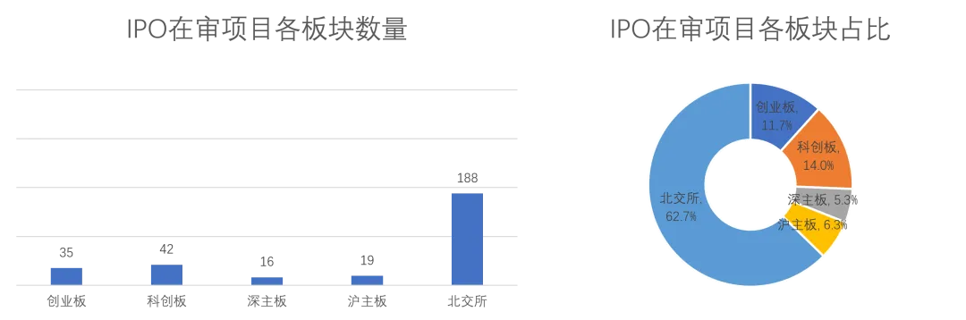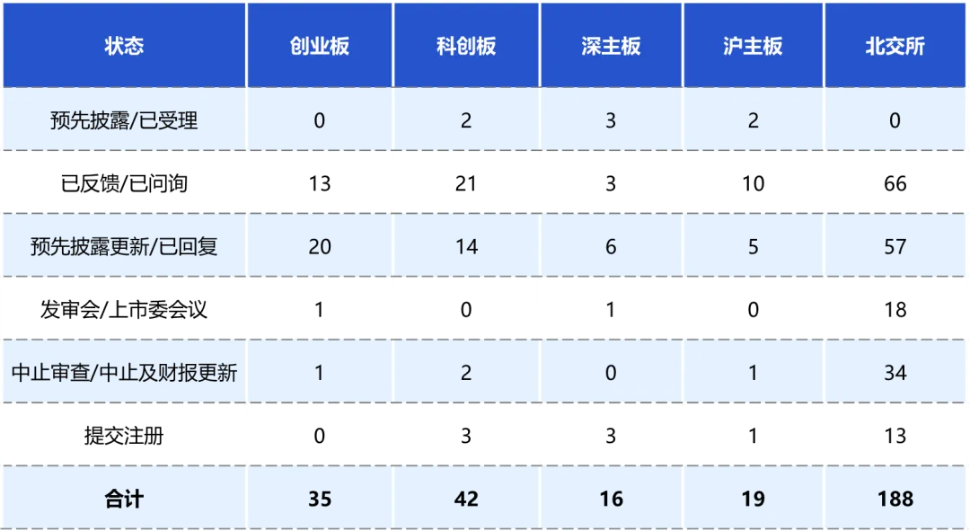 截至2026年3月24日,A股IPO在审企业合计300家。其中,创业板在审企业35家;科创板在审企业42家;深主板在审企业16家;沪主板在审企业19家;北交所在审企业188家。