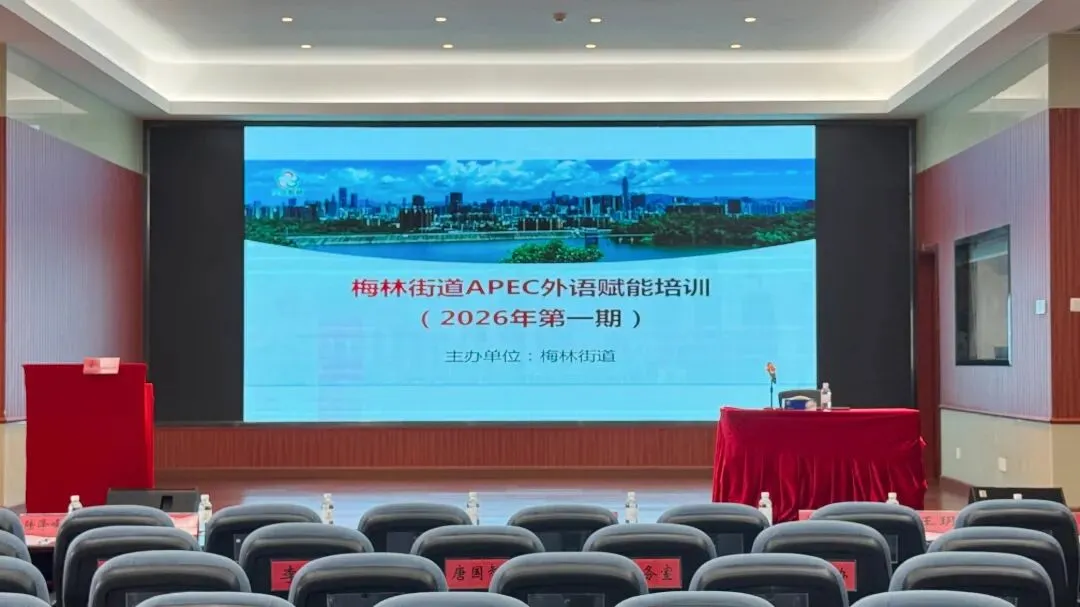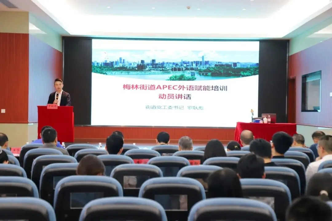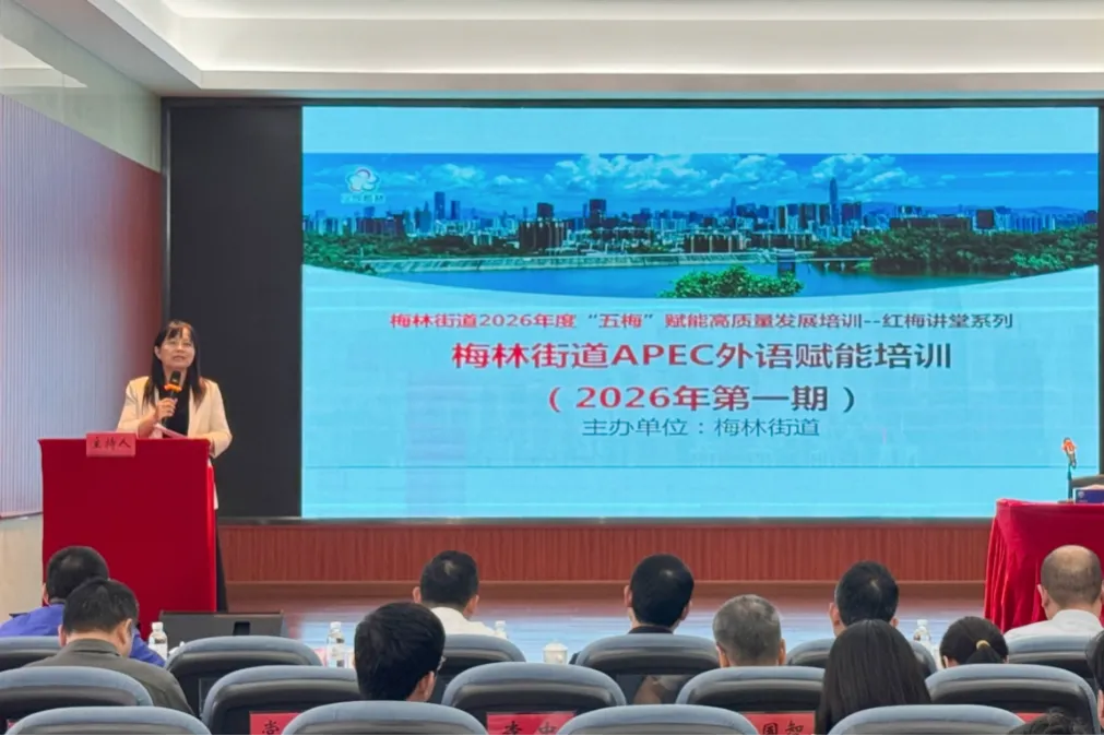 为迎接2026年APEC峰会,全面提升街社干部国际化服务水平,3月25日下午,梅林街道在九楼会议室成功举办2026年第一期“语通世界·活力梅林”APEC外语赋能培训班。