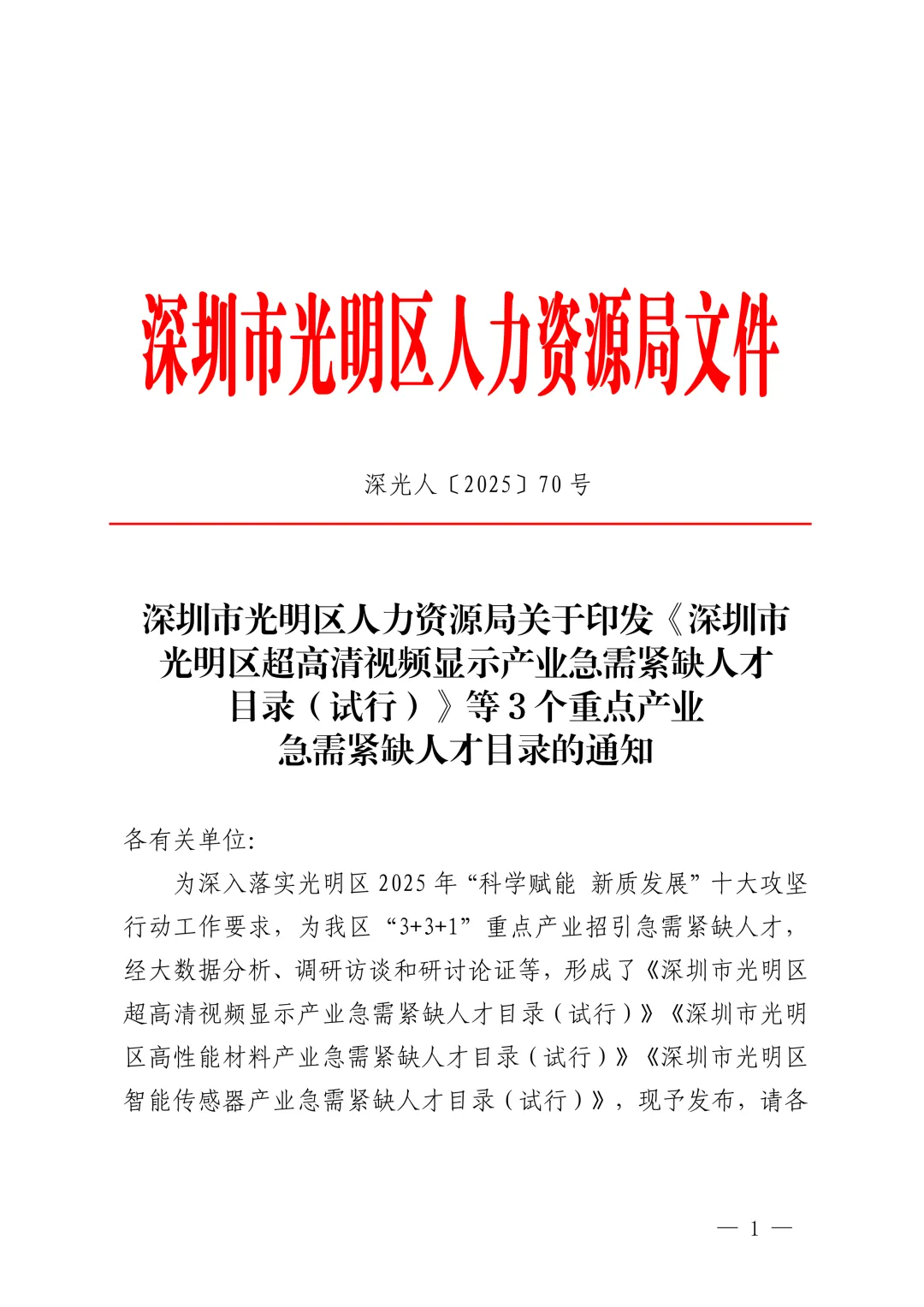 深圳市光明区人力资源局关于印发《深圳市光明区超高清视频显示产业急需紧缺人才目录(试行)》等 3 个重点产业急需紧缺人才目录的通知:https://www.szgm.gov.cn/attachment/1/1644/1644315/12478195.pdf)