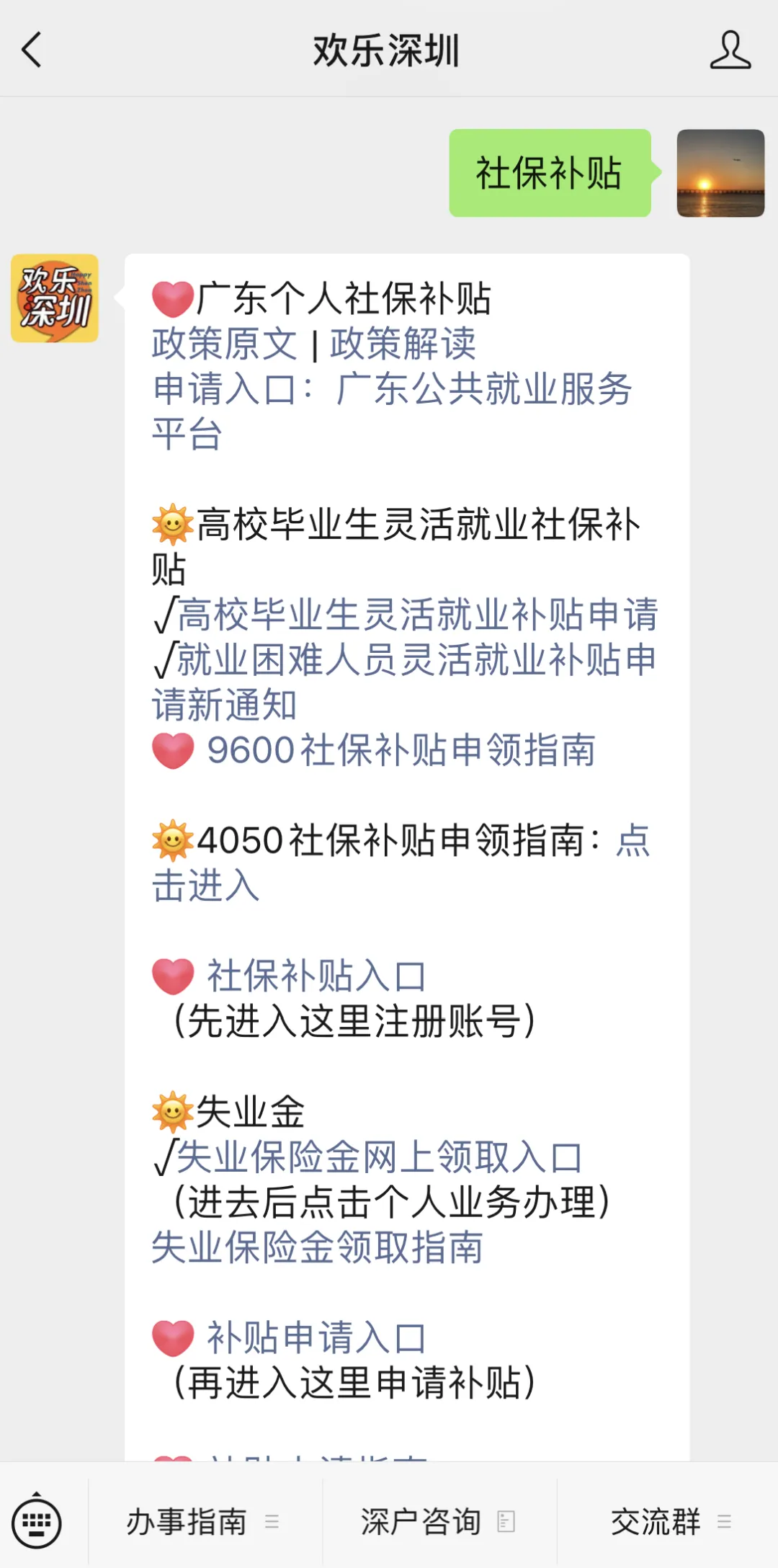 其余的社保补贴,可以在【欢乐深圳】公众号回复【社保补贴】,就可以看到个人社保补贴申请入口,政策解读、灵活就业社保补贴等详细指南和流程了!