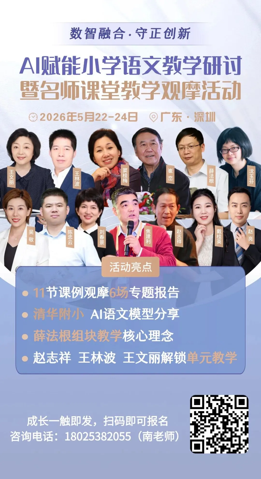 五月的深圳AI赋能小学语文教学活动可能打开新的视窗。清华附小的AI模型展示、王林波老师的融合课例,提供的是"AI+单元教学"的先行样本。此外还有薛法根、王文丽、赵志祥等名师团队的单元教学展示。