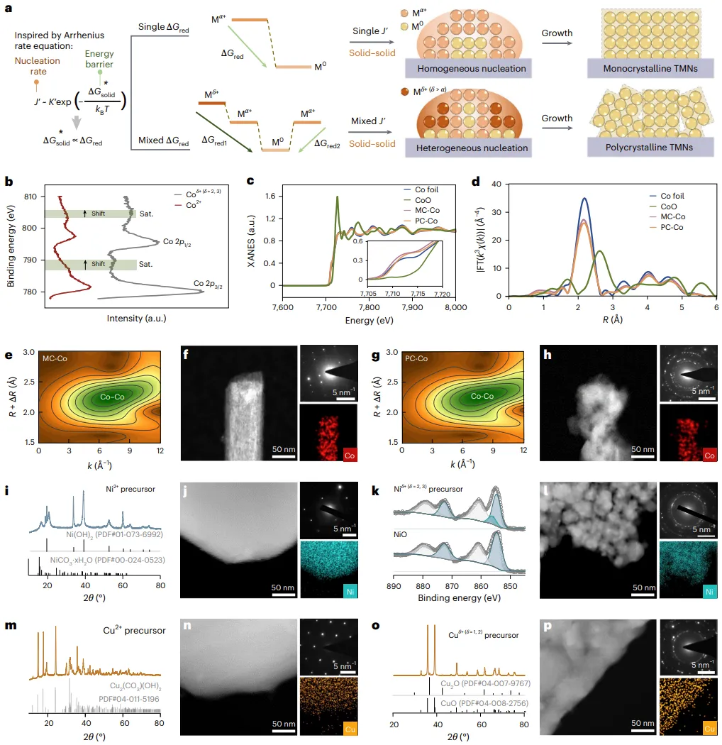 1(a) 呈现了该策略的设计原理示意图。作者基于经典成核理论,提出在固-固结晶体系中,通过选择具有单一还原能垒的前驱体,可以实现均匀成核,进而生长为单晶(MC);而选择具有混合还原能垒的前驱体(如混合价态),则会导致非均匀成核,最终形成多晶(PC)。图中以不同颜色的球体示意高、低价态金属离子,它们在还原和成核过程中的不同行为直接决定了最终晶体的周期性。1(b) 展示了单价态()和混合价态()Co前驱体的XPS Co 2p谱图。通过对比卫星峰的位置,可以明显看出两者中Co的化学状态和配位环境存在差异,为区分两种前驱体的价态多样性提供了直接证据。1(c) 和 1(d) 分别是Co K边的XANES和EXAFS谱图。XANES结果表明,合成出的MC-Co和PC-Co的吸收边位置与Co箔高度重合,证明了它们均为金属态的Co。EXAFS谱图显示,两者均在约2.17 Å处出现Co-Co配位峰,与Co箔一致,进一步确认了其金属特性。1(e) 和 1(g) 分别为MC-Co和PC-Co的小波变换(WT)分析。两者的WT图均在Co-Co键对应的位置(约7.0 Å⁻¹,2.0 Å)显示出单一强度最大值,再次确认了其化学态为金属Co。1(f) 和 1(h) 是MC-Co和PC-Co的HAADF-STEM图像及对应的SAED花样。图1(f)中,MC-Co显示出均匀的形貌和明亮的单晶衍射斑点,证实其为单晶结构。图1(h)中,PC-Co则呈现出多颗粒堆叠的形貌,SAED花样为典型的多晶环,证实了其多晶特性。对应的EDS元素分布图显示了Co元素的均匀分布。1(i) 和 1(j) 展示了该策略在Ni体系中的拓展。图1(i)是单价态Ni前驱体的XRD图谱,图1(j)是合成的MC-Ni的HAADF-STEM及SAED图像,显示其单晶特征。1(k) 和 1(l) 展示了Ni体系中混合价态前驱体(NiO-Ni₂O₃)的XPS谱图与合成的PC-Ni的HAADF-STEM及SAED图像,显示出其多晶特征。1(m) 至 1(p) 则展示了该策略在Cu体系中的成功应用,分别呈现了单/混合价态前驱体的XRD图谱,以及对应的单晶MC-Cu和多晶PC-Cu的HAADF-STEM与SAED图像。这些结果共同证明了“前驱体价态门控”策略在合成MC/PC-TMNs方面的普适性。